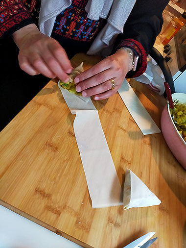 語源は「三角形」から来ています。三角形のパイで中身は何でもいいのですがパレスチナでは肉やチーズ、ザータールなどを詰めます。旨みたっぷりでパリパリで美味しいですよ。