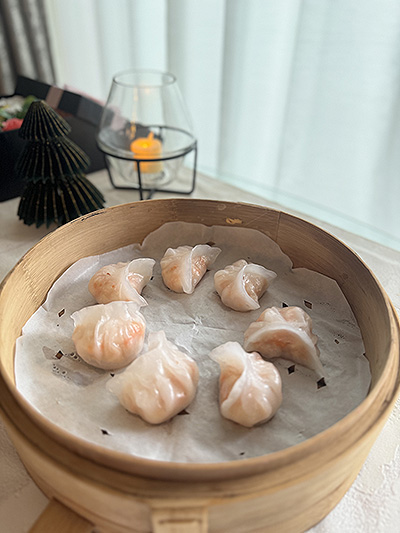 お正月の祝いにふさわしい華やかなエビ餃子。透明感のある皮で包まれたエビの甘みが口いっぱいに広がります。伝統的なデザインとともに、「金魚」の形もご用意しました。金魚は中国文化で財運や幸運を招く縁起物とされ、新年にふさわしい祝福を添えます。
