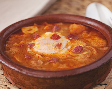 たっぷりのニンニクと卵を使い、滋養にあふれた優しくも力がつくスープです。首都マドリッドのあるスペイン中央部カスティーリャ地方の郷土料理です。 固くなったバケットをスープに入れて厚みを出します。 ガスパチョ、ソパ・デ・アホのスペイン2大スープの一つでもあります。