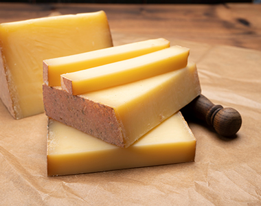 ベルギー北部とフランス北部にまたがるビール作りで有名なフランドル地方で誕生したミモレットは、太陽のように鮮やかなオレンジ色をしています。保存性が高いハードチーズとして、交易や遠征の際にも重宝されました。そのほのかな甘みとカラメルのような香ばしさは、野菜サラダにも豊かな表情を与えます。