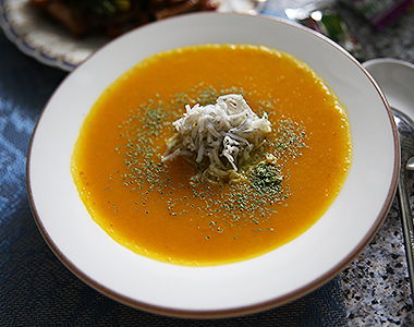 今回は季節の食材であるかぼちゃをメインに使った「羹(グン)」をご紹介。なめらかな舌触りのかぼちゃのスープのアクセントは、なんと『しらす』。かぼちゃとしらすという、ちょっと意外な組み合わせが織りなす味わいをぜひ体験してみてください。
