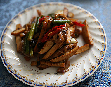 今回は皮付き豚バラ肉、ニンニクの芽、搾菜と合わせ、豆豉の豊かな旨みとコクで炒めたひと皿をご紹介。消化を助け疲労回復にも効果的、気を養う食材としても知られている押し豆腐を使った 豆鼓炒豆乾。ヘルシーで食べ応えのある、滋味深い味わいを愉しめるひと皿です。
