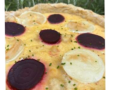 アルザス風の薄い生地をカリッと焼き上げ、クリーミーなシェーブルチーズと生クリームをのせ、その上に甘みを増したローストビーツを散らします。仕上げにチャイブを添えて、軽やかなサラダと一緒に楽しむ素朴で洗練された一皿です。