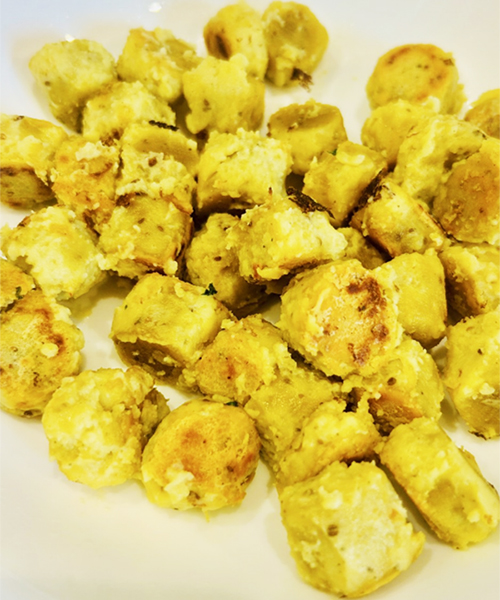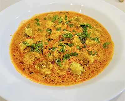ひよこ豆粉で作る団子をスパイスヨーグルトで煮込んだ温かみのある一品。