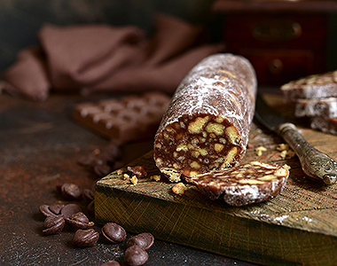 実はチョコレート、ビスケット、ナッツで作られた美味しいデザート。スペイン菓子の創造性豊かな一面を見せてくれる、ユニークな一品です。