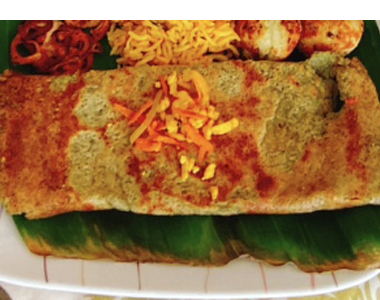 南インド料理ファンならきっと好きなドーサ。平焼きパンのような、クレープのような形で、外面がカリッと、内側はホットケーキを焼いたときのような空気の穴が開いていたら、おいしいドーサの証拠。通常はウラドダルや米を発酵させて生地を作りますが、今回はひき割り緑豆のムングダルで作る一風変わったドーサです。ムングダルはアーユルヴェーダでも使われる、南インドらしい風味のする豆です。