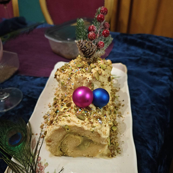 DESSERT : Bûche de noël à la pistache, mascarpone et framboise.