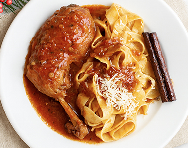 メインは華やかで、冬に温もりをもたらしてくれる鶏の赤ワイン煮です。切ればほわっと湯気が立ち、柔らかく煮込んだ鶏肉には赤ワインの風味が染み込んでいます。