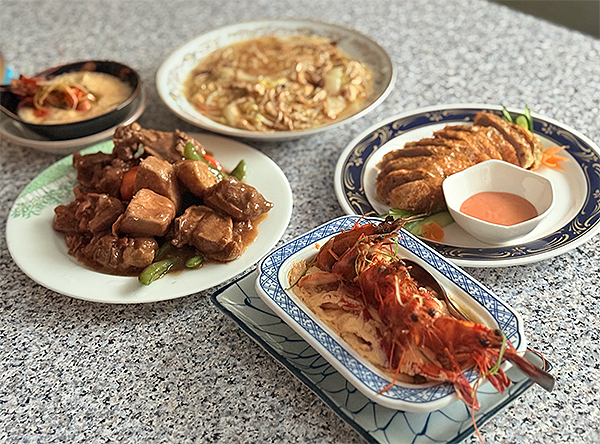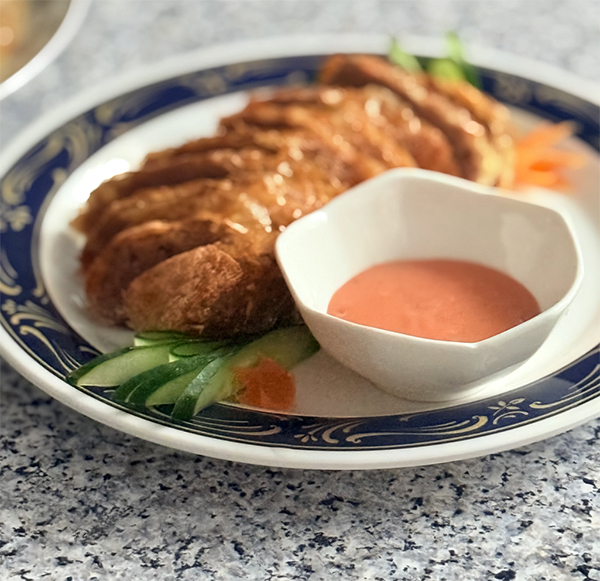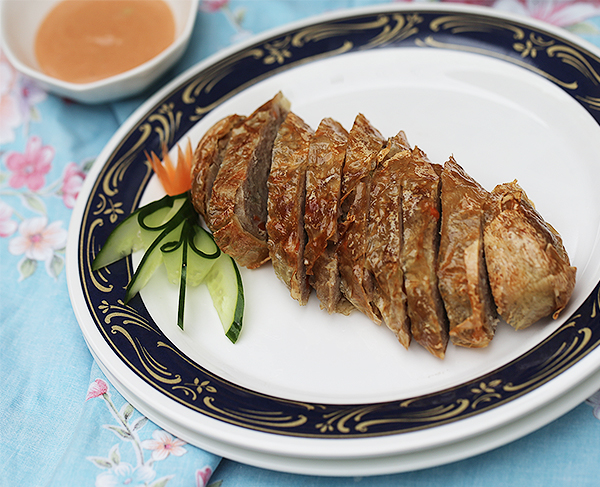 豚ひき肉に刻んだ野菜を混ぜて湯葉で巻き、蒸した後に表面を香ばしく焼き上げた、台湾の定番お祝い料理。湯葉には「福を包む」、その形には「幸福を巻き込む」という意味があります。調味に使う五香粉は、シナモン・クローブ・八角など五種の香辛料をブレンドしたもの。古代中国では「五福(長寿・富貴・健康・徳・安らぎ)」を象徴する吉祥の香りとされ、邪気を払い福を招くといわれます。  五香粉の芳しい香りが台湾らしさを感じさせる『腐皮五香巻』は、ケチャップとマヨネーズに陳さんの“ひと味”を加えた特製ソースでいただきます。ここでしか味わえない独特の風味のソースもお楽しみに!