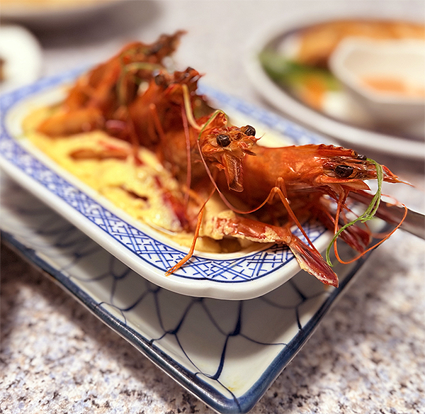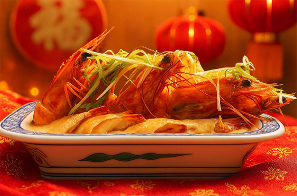 有頭海老を贅沢に使い、春雨とともにふんわり卵液で蒸し上げた華やかな一品。器の底に敷いた春雨と卵に海老の旨味が染み込み、格別の味わいです。卵の黄色は「金運・豊かさ」、海老の赤は「喜び・長寿」を象徴し、海老の反り返る姿は人の笑顔のように「喜上眉梢(喜びが顔に表れる)」を表します。新しい年を元気に迎えるのにふさわしい幸福あふれるお料理です。<写真は1名様分のお料理となります>