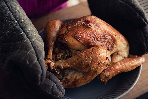 ハーブバターをたっぷりと塗り込み、じっくりとローストした七面鳥。