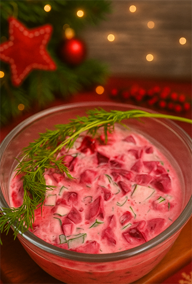 クリスマスカラーを思わせる鮮やかなビーツに、爽やかなきゅうりとディルを合わせ、
