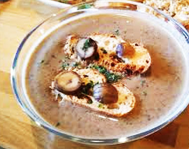 仕上げにチキンコンソメを注ぎ、ガーリックトーストを添えてお召し上がりいただきます。