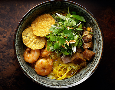 カレーのようにスパイスが香り、具沢山で彩り豊か、そして「スープ少なめ」が特徴です。現地ではお祝いの席でも食べられる、ちょっと特別なごちそう麺です。