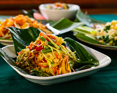 シャキシャキの青いパパイヤに、にんじん、ピーナッツ、そして香り高いハーブをたっぷり合わせます。