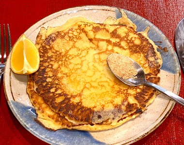 伝統的なクレープ風パンケーキが作られてきました。レモン汁とお砂糖をかけていただくのが昔ながらのスタイル。
