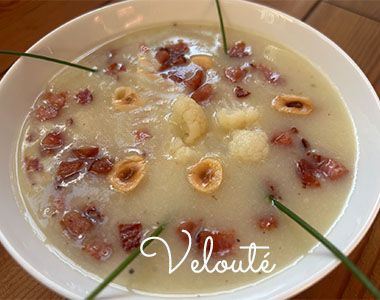 ● カリフラワーのヴルーテ ヘーゼルナッツとベーコン添え