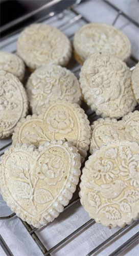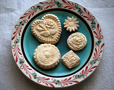 このビスケットのレシピはドイツ由来のお菓子SPRINGERLE (シュプリンガーレ)をベースに作りました。型抜きした生地を一晩寝かせてから焼くことで型抜きした模様がきれいに焼ける製法です。焼き上がりの表面は白っぽく仕上がり、ビスケットの裏側には「足」と呼ばれる土台が加熱により現れ、ほかのビスケットとは違った印象を与えます。バニラとアニスの風味が特徴ですが、アイバンのレシピではアニスフレーバーは控えめなので、より食べやすくなっております。暖かい紅茶に浸してティータイムを楽しんでください。