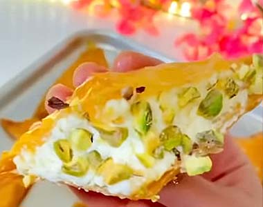 パレスチナで「ワルバット」と呼ばれているお菓子です。「Qushta"キュシュタ"」というクリームが中に詰まっていてやさしく繊細な味わいがします。