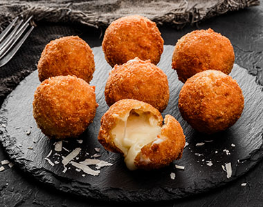 お店で席に座ったら、迷わず注文したいもののひとつ。なぜって、まもなく中からトロリとチーズが溶け出す、熱々のコロッケが運ばれてくるから。ギリシャのチーズコロッケは何種類ものチーズをミックスしているので、チーズ好きにはたまらないコク深さ。家でも作れるコツをシェフから学びましょう。