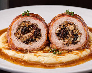 Pork Loin Stuffed with Prunes, Mushrooms and Nuts, Wrapped in Bacon Served on Parsnip Purée & Brandy Sauce