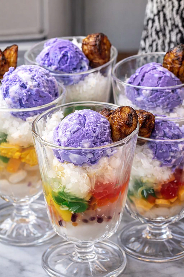 細かく削った氷に、甘く煮た豆やフルーツ、ゼリー、ウベ(紫山芋)、そしてミルキーなアイスクリームを重ね、最後は「ハロハロ(=混ぜ混ぜ)」して味わいます。