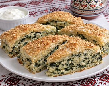 ギバニッツァ(Gibanica)は、バルカン半島発祥の伝統的なペイストリーで、フィロ生地(薄いパイ生地)と、チーズ、卵などを重ねて焼いたものです。セルビアの代表的な家庭料理・お祝い料理で、塩味から甘味まで幅広く、肉、ほうれん草、りんごなど様々な具材が使われ、ヨーグルトと一緒に朝食や軽食としても親しまれています。 今回はほうれん草とチーズ入りのギバニッツァを作ります。