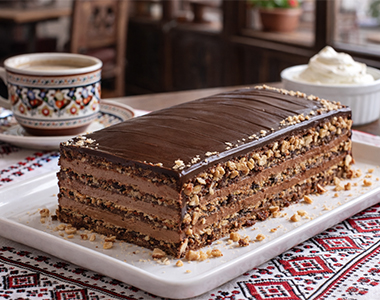 改革」という名を持つ、セルビアで最も愛される豪華な層状ケーキ。戦後の改革を経て豊かな食材が手に入るようになった喜びを象徴しています。濃厚なチョコクリームとくるみのハーモニーは格別です。(※事前に準備したものを提供し、レッスンではレシピを詳しく解説します)