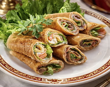ロシアの太陽を象徴すると言われる薄焼きクレープ「ブリヌイ」の、食事系スタイルです。 もちもちとした生地に、脂の乗ったスモークサーモンと、さっぱりとしたサワークリームを合わせました。ハーブ(ディルなど)の香りを添えて、伝統的な味のハーモニーをお楽しみください。