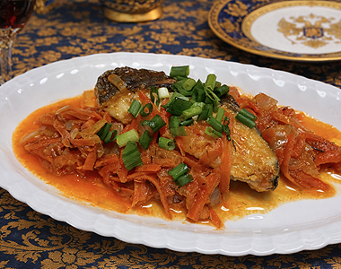 タラの本当の味わいは冬にこそ花開きます。オホーツク海などの北の海で愛される「タラ」を使った、ロシアの定番魚料理です。 淡白でふっくらとしたタラの身を、旨味たっぷりのトマトソースでじっくりと煮込みました。魚の出汁が染み出したソースを、なめらかなマッシュポテトに絡めてお召し上がりください。心も体も温まる、優しく懐かしい味わいです。季節ならではのお料理をお楽しみください。