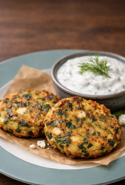 Zucchini & Feta Fritter with Yogurt Dill Dipping Sauce