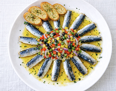 旬のイワシを天然の粗塩だけでマリネし、魚本来の旨味と食感を引き出しました。スペイン産エクストラバージンオリーブオイルと白ワインビネガーで作ったビネグレットソースに、赤・緑のパプリカ、紫玉ねぎの薄切り、緑と黒のオリーブ、パセリを加えた爽やかなマリネです。冷たく冷やして提供し、ガーリック風味のトーストしたパンとともに。