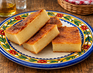 スペイン北部、カンタブリア地方の伝統的なチーズケーキ。フレッシュチーズ、卵、砂糖、シナモンで作られた、しっとりと濃厚ながらも優しい甘さが特徴です。冷やして提供し、仕上げにシナモンパウダーを振りかけました。