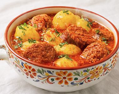 スペイン北部、ラ・リオハ地方の伝統的な煮込み料理。ホクホクのじゃがいもを、パプリカ(パプリカ・デ・ラ・ベラ)、ローリエ、そして非燻製の自家製チョリソと一緒にじっくりと煮込みました。