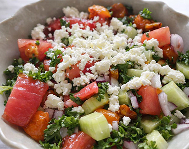 瑞々しい野菜に白チーズをたっぷり添えた、彩りも美しい伝統的なサラダです。ブルガリアはサラダが食文化の中心。中でもショプスカ・サラダが最も人気のあるサラダです。
