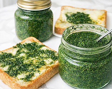 瓶詰めのハーブは、驚くほど万能です。サラダに和えるのはもちろん、肉や魚の本格的なソースとしても活躍します。さらに、カリッと焼いたトーストにのせるだけのシンプルな食べ方も、格別の美味しさです。」