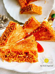 ムンバイといえば、パン好きの多い街。他では見かけないユニークなサンドイッチやお惣菜パンに出会えます。バター風味のカリカリトーストと、カリカリの「ブジア」をまぶしたサンドイッチ。子どもから大人まで人気の軽食です。