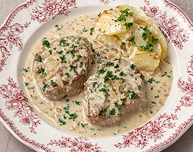 柔らかく仕上げた豚のフィレ・ミニョンに、コクのある濃厚なマスタードソースを合わせました。ビストロの王道らしい、温かみと深みのある味わいの一皿です。