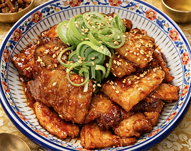 サムキョプサル(又は肩ロース)のお肉から出た旨味たっぷりの脂とタレをサッと炒め合わせることで、濃厚で中毒性のある味わいに仕上がります。