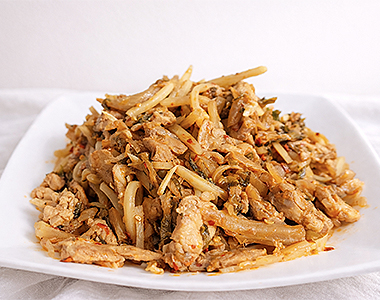 ミャンマーの家庭や食堂で広く親しまれている、酸味と辛味がクセになる炒めものです。 発酵させた高菜(チャンムサイ)とタケノコ(ミイ)の酸味が、鶏肉のジューシーな脂と絶妙にマッチします。これさえあれば、ご飯がいくらでも進みます。