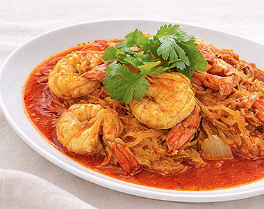 ミャンマー料理の真髄とも言える「スィーピャン(油戻し)」技法で作る、エビの旨味が主役のカレーです。 たっぷりの玉ねぎ、トマト、そしてスパイスをじっくり炒めることで、エビの濃厚な出汁がオイルに溶け込み、深いコクが生まれます。
