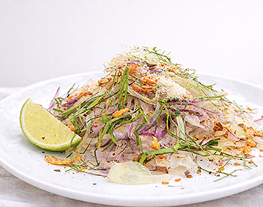 ミャンマー流の「お口直し」として愛される、フレッシュなサラダです。 スライスした玉ねぎをベースに、香ばしいピーナッツや豆の粉、スパイスを効かせたオイルで和えます。