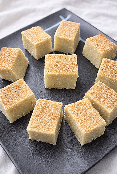 ミャンマーで最も愛されている伝統菓子の一つです。 もともとはインドから伝わったお菓子が、ミャンマーの風土に合わせて独自に進化しました。「サヌイン(ターメリック)」という名の通り、かつては色付けにターメリックが使われていましたが、現在はじゃがいもとココナッツミルクを贅沢に使うのが主流です。