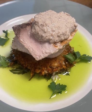 ◆メカジキのグリル、クリスピーリゾットケーキとクルミのサルサ