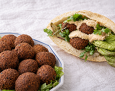 ファラフェルは地域によって使う豆や香りが異なります。エジプトでは乾燥そら豆を使うことが多く、内側が鮮やかな緑色で、ハーブの香りが豊かです。レバノンではひよこ豆を使うのが一般的で、パセリやコリアンダーの爽やかさが立ちます。モロッコではファラフェルはひよこ豆を使いスパイス感がややしっかりした味わいに。タヒニと一緒にお召し上がりください。