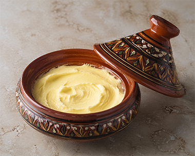 モロッコの家庭には、母から娘へと受け継がれる「宝物」があります。 今回のレッスンでは、その象徴ともいえる”発酵バター「スメヌ(Smen)」”を軸に、素朴ながらも贅沢なモロッコの宮廷・家庭料理を学びます。スメヌは、バターを煮詰めて不純物を取り除き、熟成させた伝統の「発酵バター」です。モロッコでは「古いほど価値がある」とされ、娘の誕生日に仕込んだ壺を結婚式に掘り出すという素敵な風習も。 熟成が進むとブルーチーズのような芳醇な香りに変わり、クスクスやパンに一揉み加えるだけで、料理に深いコクと歴史の魔法をかけてくれる、モロッコの食卓の魂とも言える調味料です。
