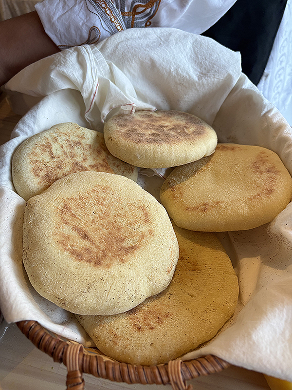 グラハム粉(全粒粉)を表面にまぶして焼き上げる、ザクザクとした食感が楽しいモロッコの定番パン。(作り済み 説明有)
