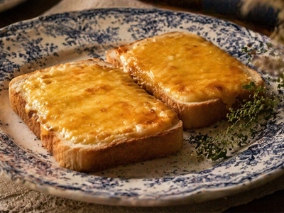 ◉ウェルシュ・ラビット(英国風濃厚チーズトースト) 一般的なチーズトーストとは一線を画す、イギリスで長く愛されてきた一品。チーズソースにビールを加えることで生まれる、香ばしさと深いコク、やみつきになる旨味が特徴です。