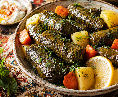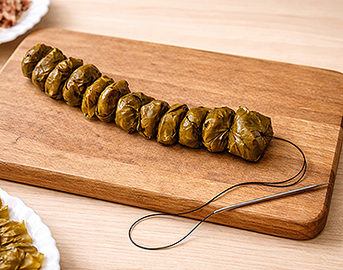 スパイスを効かせたひき肉を繊細な若葉で一つひとつ包み込み、それらを針と糸で数珠つなぎにしていきます。これは、大きな鍋(カザン)の中で大量のお米と炊き込んでも、形を崩さず美しさを保つための古くからの知恵。炊き上がりの瞬間、お米の上に輝くドルマからするりと糸を引き抜く仕草は、おもてなしの席を最高潮に彩る特別な儀式です。