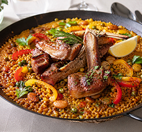 魚介のパエリアとは一味違う、肉の力強さを堪能できる一品です。骨付きの豚スペアリブを焼き固め、その濃厚な肉汁をお米一粒一粒に閉じ込めました。お米の表面はパラッと、底には香ばしい「おこげ(ソカラ)」が広がる、ボリューム満点のメインディッシュです。